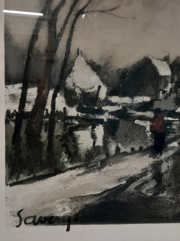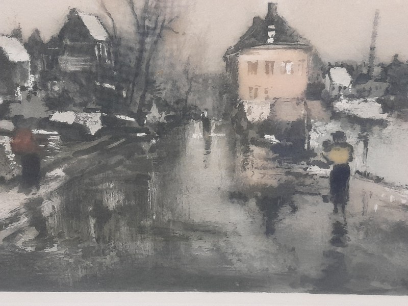 - Een winters landschap met een dorpsstraat langs een rivier. Er zijn enkele huizen, kale bomen en een molen op de achtergrond zichtbaar. De sfeer is grijs en somber, waarschijnlijk door het bewolkte weer. Twee figuren lopen op de natte weg, die reflecties van hun omgeving weerkaatst.