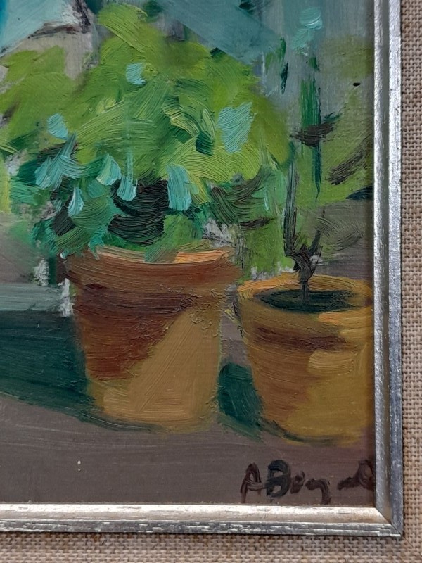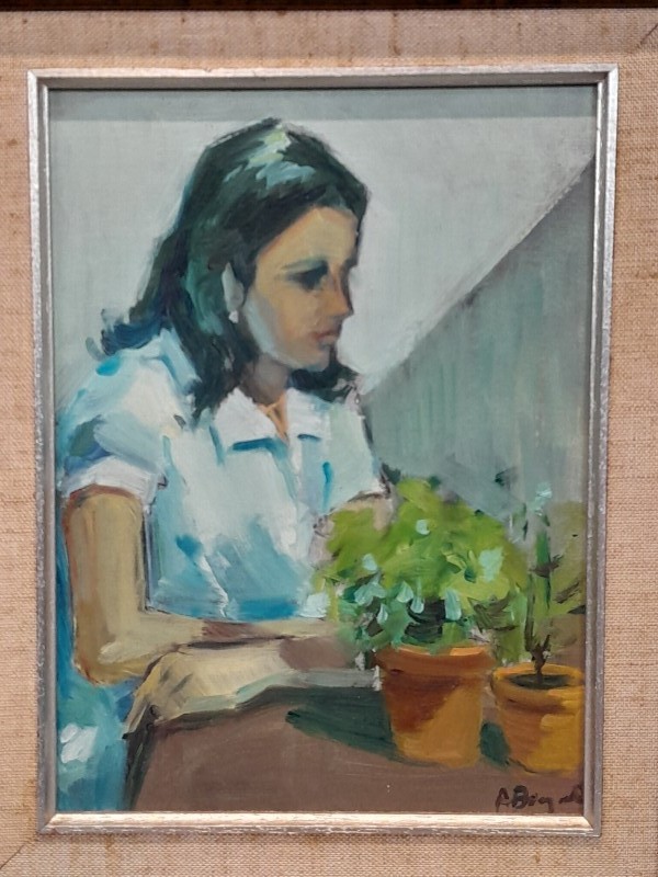Dit sfeervolle olieverfschilderij toont een intieme en rustgevende scène van een vrouw in gedachten verzonken, omringd door groene planten. Een tijdloos kunstwerk dat warmte en serene schoonheid uitstraalt.