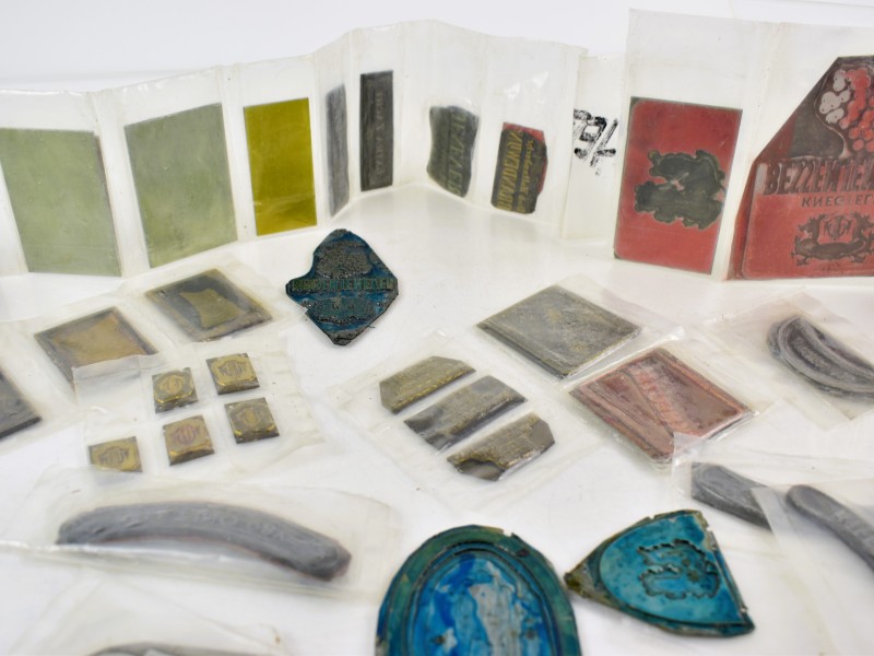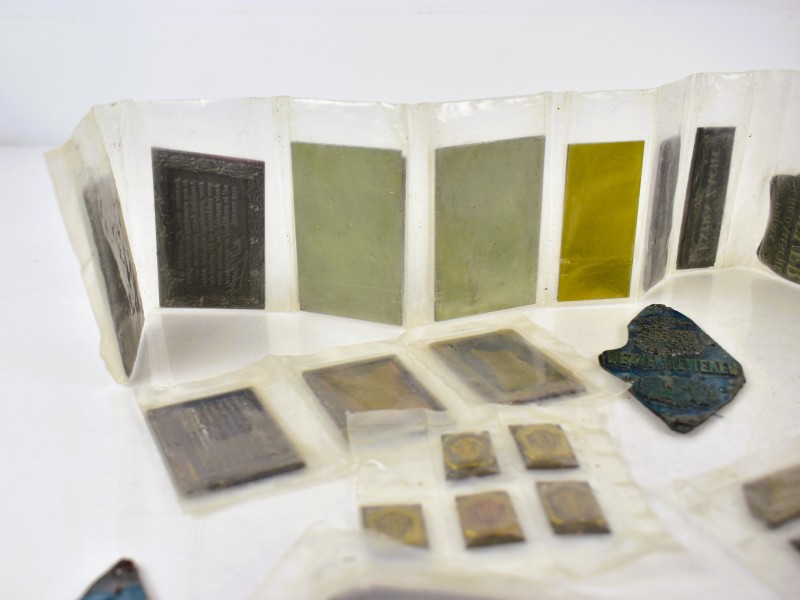 Deze uitgebreide verzameling bevat metalen en kunststof drukplaten die werden gebruikt voor het maken van flessenetiketten, voornamelijk voor sterke dranken en wijnen. De collectie toont verschillende vormen, kleuren en druktechnieken. De meeste platen zijn voorzien van teksten van het merk Knegtel bessenjenever. De clichés zijn vermoedelijk afkomstig van een voormalige drukkerij of drankfabrikant. Ze werden gebruikt voor het bedrukken van papieren etiketten op glazen flessen. Sommige platen zijn nog voorzien van pigmentresten in rood, zwart of blauw. Andere zijn gevat in transparante mappen ter archivering of presentatie. Eén opvallende plaat toont een olifantenfiguur in reliëf, mogelijk bedoeld voor een exotische drank. De stijl, vormgeving en materiaalgebruik wijzen op een datering in de 20e eeuw, mogelijk tussen 1920 en 1980. Deze verzameling is interessant voor verzamelaars van industrieel erfgoed, grafisch ontwerp of drankenverpakkingen.