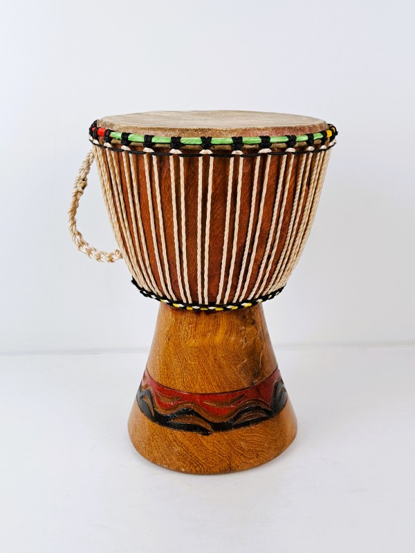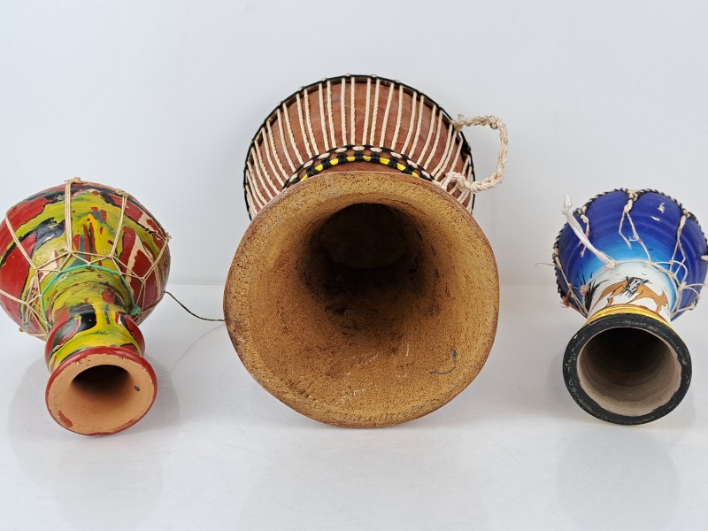 Deze set bestaat uit drie handgemaakte djembé-trommels van verschillende formaten. De grootste trommel is gemaakt van massief hout en touwbespanning. Ze heeft een klassiek West-Afrikaans ontwerp. De kleinere exemplaren zijn beschilderd met kleurrijke motieven, waaronder een woestijnlandschap met kamelen. De trommels zijn bespannen met natuurlijk vel. Djembés worden traditioneel gebruikt bij ceremonies, dans en samenzang. Ze komen vooral uit landen als Mali, Guinee en Tunesië. Dit is een sfeervolle en decoratieve set voor muzikanten of verzamelaars.