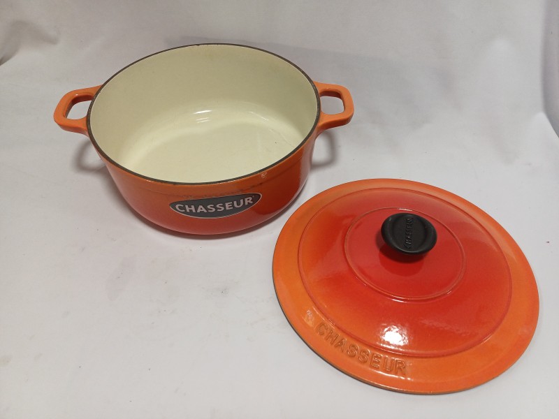 Set van 4 Franse gietijzeren stoof-/braadpannen met deksel van het merk Chasseur