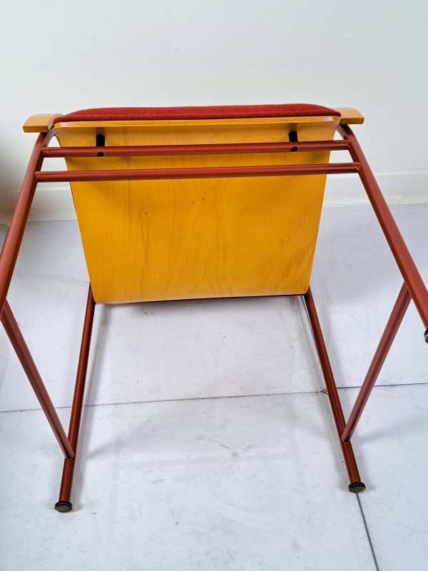 Deze set bestaat uit vier opvallende designstoelen, waarschijnlijk uit de jaren 80 of 90. De stoelen hebben een bijzondere vorm met een ovale rugleuning en elegant gebogen houten armleuningen. Het frame is gemaakt van rood metalen buizen, wat zorgt voor een luchtige en moderne uitstraling. De zitting en rug zijn bekleed met warm bordeauxrode stof. De achterkant van de rugleuning is afgewerkt met gebogen fineer in een lichte houtkleur. Deze stoelen passen goed in een retro interieur, maar ook in een modern kantoor of wachtkamer.