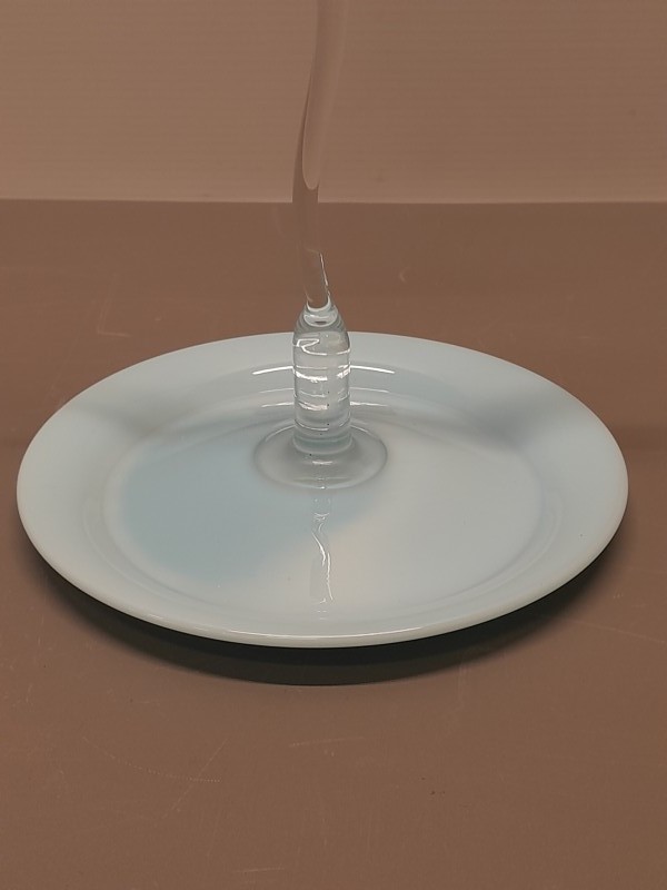 - Staat stabiel op een ronde glazen voet in zachte blauwtint