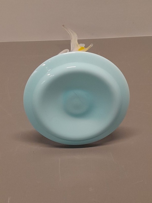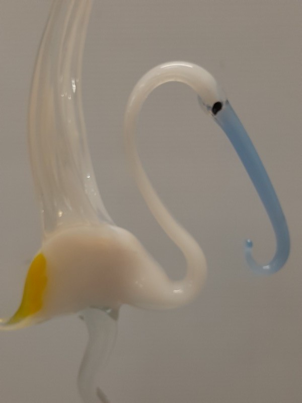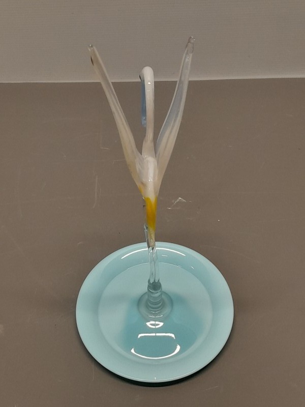 Een elegante glazen vogel op voet, vervaardigd uit mondgeblazen glas. De sculptuur toont een vogel in sierlijke houding met gebogen nek en omhooggerichte vleugels. Het object is gemaakt met oog voor detail en vakmanschap, en bevat subtiele kleuraccenten in blauw, wit en geel. Het beeldje is in goede staat, zonder zichtbare chips of barsten. Ideaal als decoratief stuk of als aanvulling op een collectie glaskunst