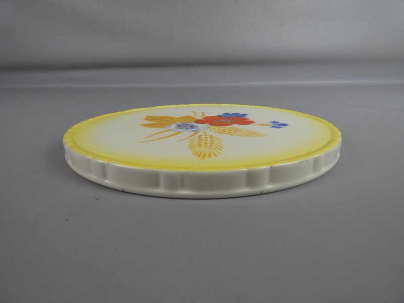 Stijl & Techniek: Uw schotel heeft een handgeschilderd of decal decor (bloemen en korenaren) op een wit-gele ondergrond.
