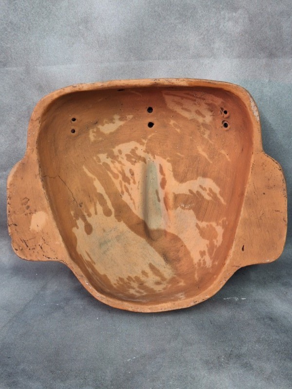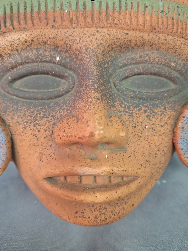 - Materiaal en Kleur: Het masker is gemaakt van terracotta, een soort gebakken klei, en heeft een karakteristieke oranje-bruine kleur met sporen van groene en witte accenten, vooral rond de ogen en het voorhoofd.