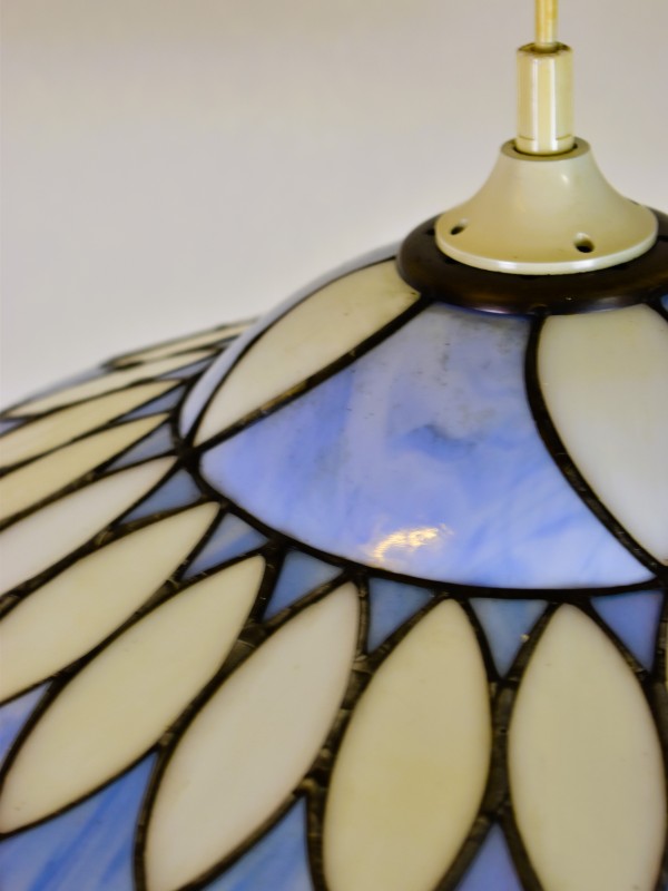 Decoratieve hanglamp in Tiffany stijl. De kap is gemaakt uit glas-in-lood. De lamp heeft een bloemmotief. De kleuren zijn blauw en crème. De glazen stukken zijn met lood verbonden. De rand heeft een speelse, golvende vorm. Dit geeft een sierlijk effect. De lamp verspreidt warm en zacht licht. Mooi boven eettafel of in hal. Past in klassiek of landelijk interieur. Voorzien van fitting voor één lichtpunt. Wordt geleverd met ophangsnoer en plafondkap.