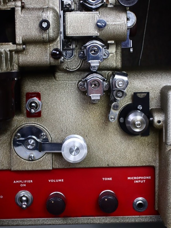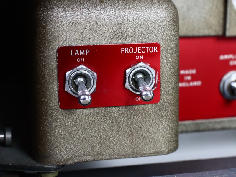 Bediening: Schakelaars voor Lamp On, Projector On, Amplifier On; Forward / Reverse (handig voor terugspoelen)