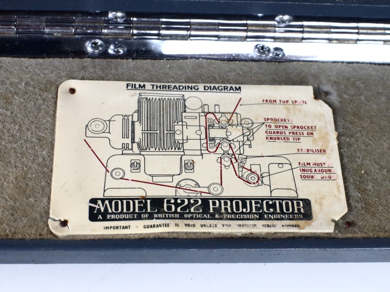 Een Vintage 'draagbare' 16mm Projector — Model 622 van GB Bell & Howell, in Engelse licentiebouw geproduceerd in Groot-Brittannië door British Optical & Precision Engineers in de jaren 1950–1960, meer bepaald 1955. Een fijn exemplaar voor verzamelaars van filmapparatuur of als blikvanger in een filmstudio of interieur.