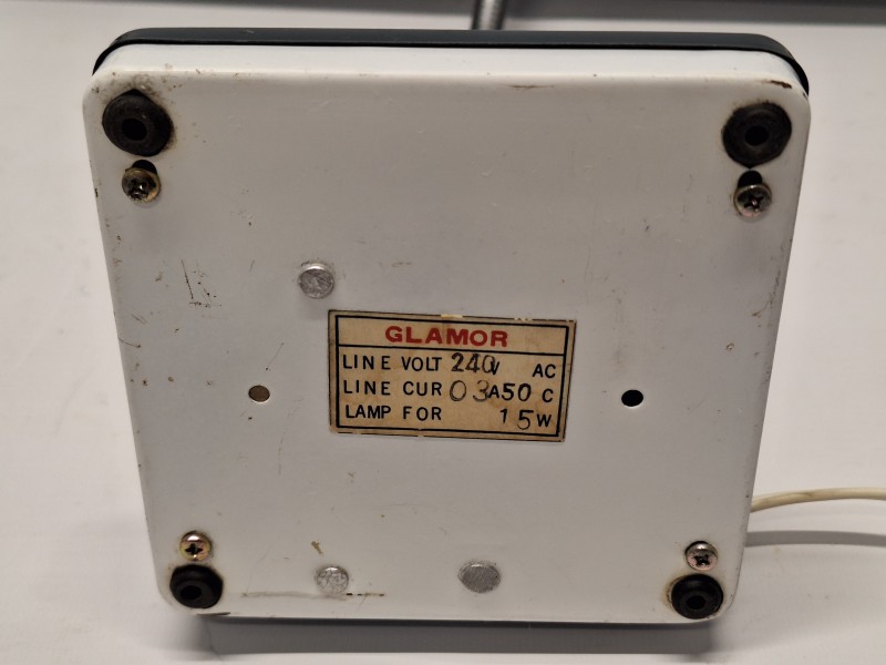 - Markeringen & specificaties: Label aan onderzijde: GLAMOR – Line Volt 240V AC – Lamp for 15W.