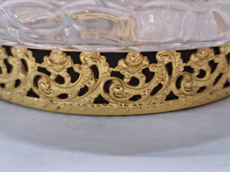 - Materiaal: Diamantgeslepen kristalglas met piramidepatroon en een opengewerkte messing ring met klassieke krul- en bladmotieven