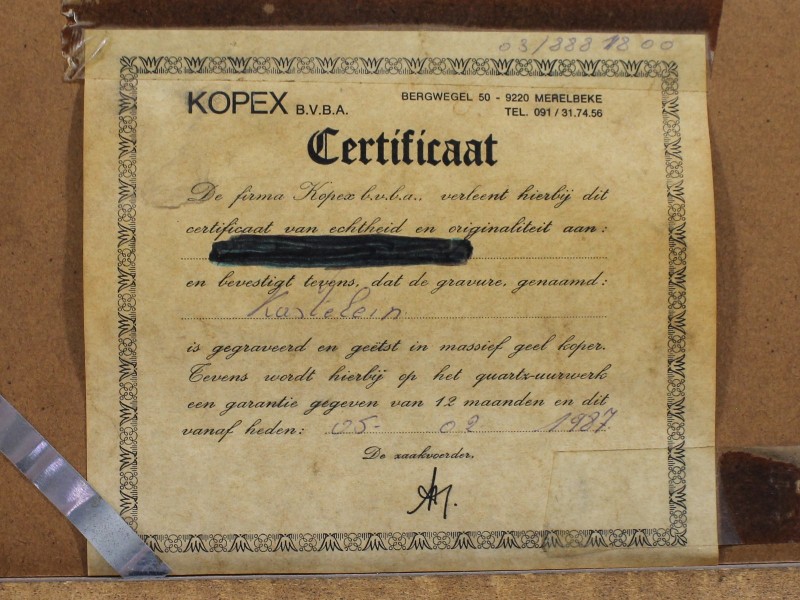 Dit exemplaar wordt vergezeld van het originele certificaat van echtheid, gedateerd 5 februari 1987, wat bijdraagt aan de herkomst en charme van het stuk.