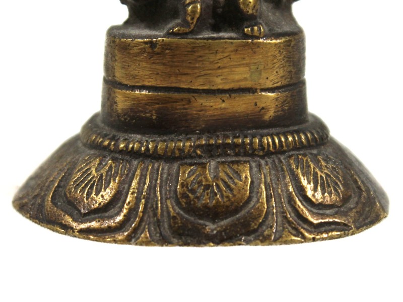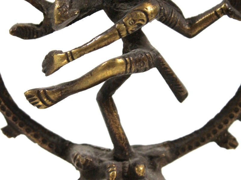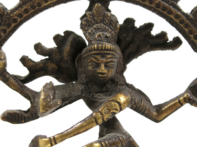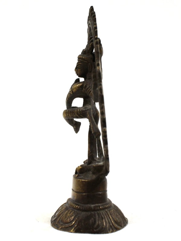 Het beeldje is vervaardigd in messing, met een warme goudgele toon op de verheven partijen en een donkere, diepbruine patina in de verdiepingen — het resultaat van jaren gebruik en tijd. De figuratie is correct en volledig iconografisch: de damaru-trommel in de rechterhand, het vuur in de linker, de abhaya mudra (het gebaar met de opgeheven, open rechterhand, palm naar voren, wat "vrees niet" of bescherming betekent), de sierlijke kaarshaartooi en de gestileerde vuurring met tanding rondom.