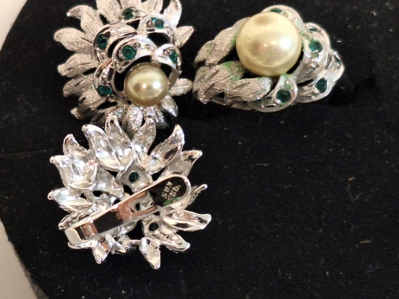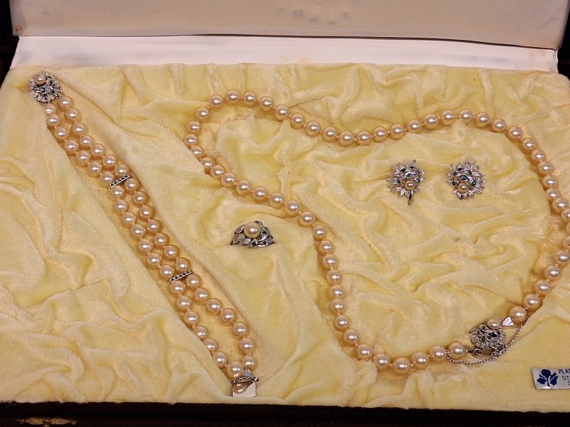 Mooie parelset bestaande uit halsketting, armband, oorbellen en een ring met groen steentje en zirkona.