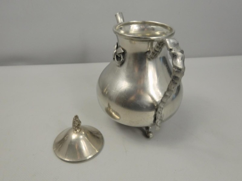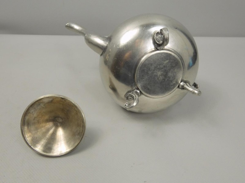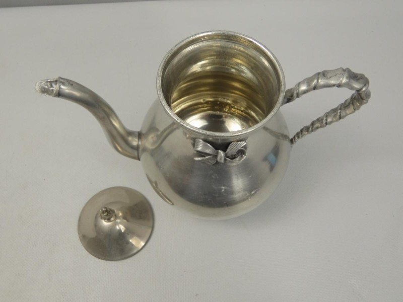 Prachtige vintage tinnen theepot met een charmant, bolvormig design. De theepot is versierd met een sierlijke strik aan de voorzijde en staat op elegante pootjes.