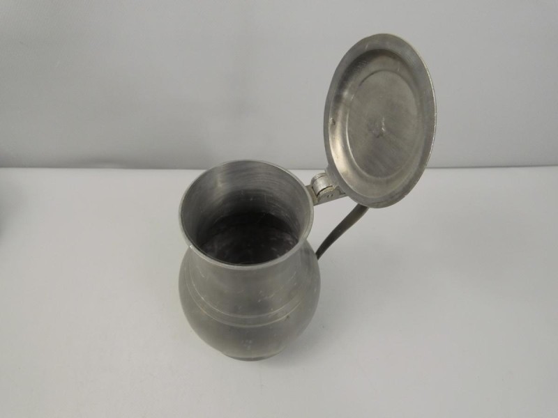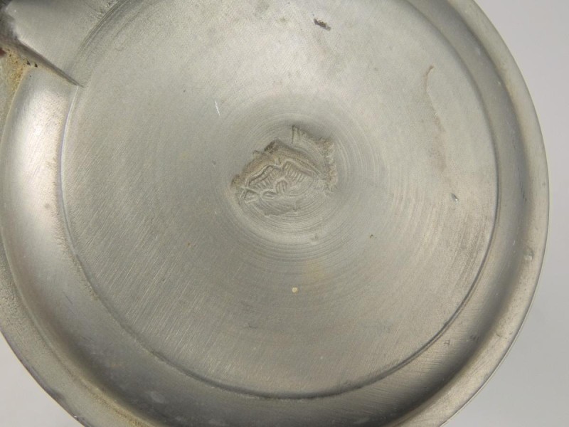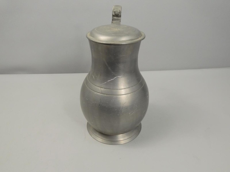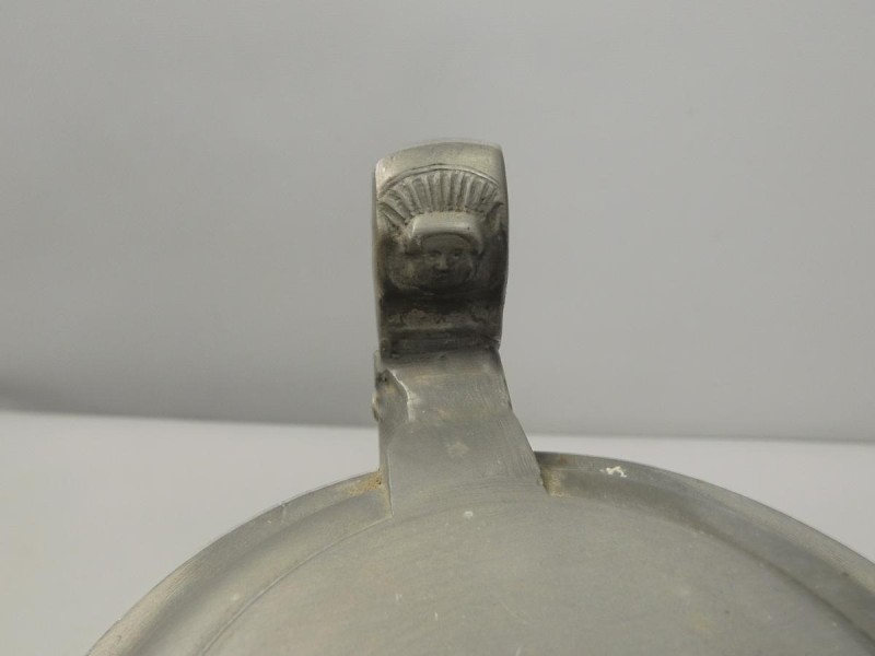 Dit is een tinnen kan met een klassieke, bolle vorm en een scharnierend deksel. De kan heeft een gebogen handvat met een verfijnde duimrust in de vorm van een gezichtje, wat een charmant detail toevoegt aan het verder functionele ontwerp. Op de onderkant is een onduidelijk merk te zien, wat waarschijnlijk het meesterteken of stadsteken van de tingieter is.